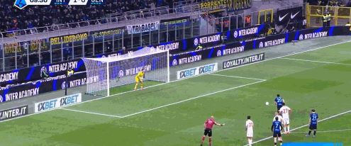 第70分钟,路易斯·恩里克禁区内右侧抽射边线后击中立柱,随后自己得球再尝试传中!皮球打在亚历克斯·阿莫林手臂上!主裁判罚点球!恰尔汗奥卢主罚命中,国米2-0领先热那亚