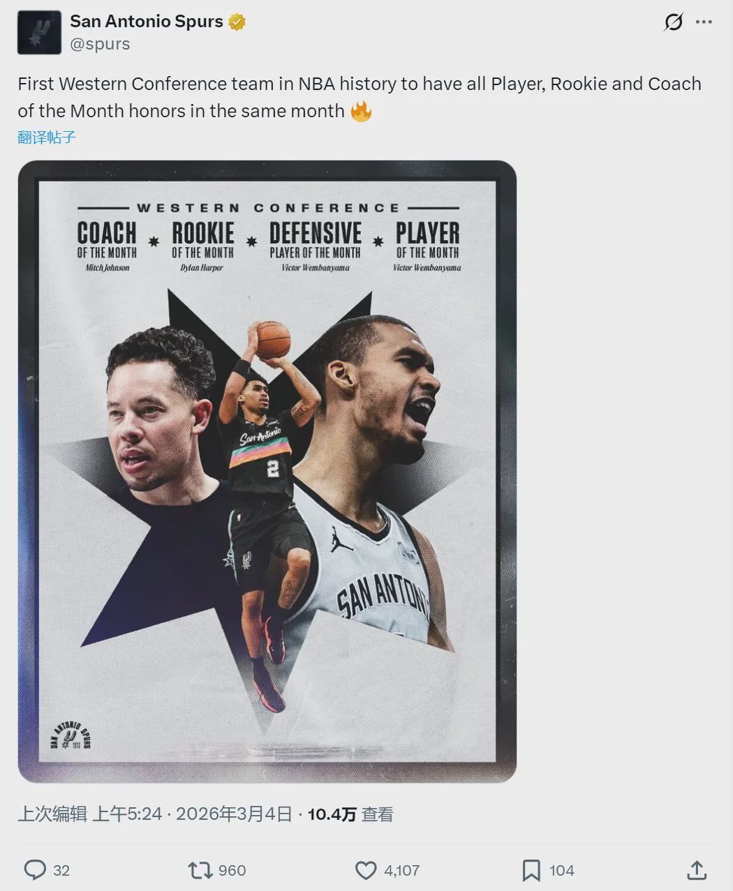 此外,文班亚马和德里克-怀特分别当选西部和东部二月份最佳防守球员。“月最佳防守球员”是从2024-25赛季开始设立的一个新奖项,但月最佳球员、教练和新秀的奖项由来已久。马刺成为NBA史上第一支包揽西部这三大奖项的球队。